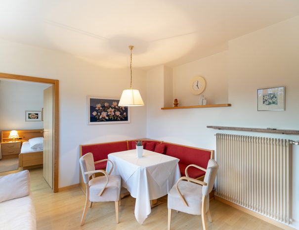 Appartement 5 (ca. 45 m²) Landhausstil in der "Villa Fortuna" Qualitätssiegel vom Land Südtirol: 4 Sonnen ab € 93,- für die Wohnung/Übernachtung - Südterrasse (ca. 13m²) mit Stühlen, Tisch und Liegestühlen - Doppelbett-Zimmer mit Bettwäsche und Wohnzimmer - Badezimmer mit Dusche, WC, Föhn und Handtüchern - Wohnzimmer mit Satelliten-Flachbildfernseher, Sofa und Esstisch - kleine Küche (ausgestattet mit zwei Elektro-Herdplatten, Kühlschrank, Kaffeemaschine, Wasserkocher, Mikrowelle, Toaster, Geschirr) - kostenloses WLAN (Glasfaser) - Aufzug - Tresor - Tiefgarage Das Appartement wird nicht täglich gereinigt!